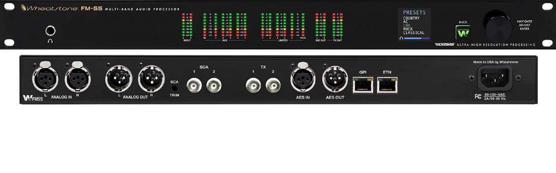 Unique among processors, the FM-55 includes new intelligent five-band AGC technology — or iAGC — coupled to a five-band limiter and stereo generator. The combination provides automatic and superior real-time program density control for a consistent, spectrally-balanced sound regardless of density variations in incoming source material.