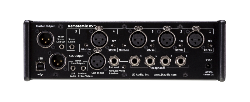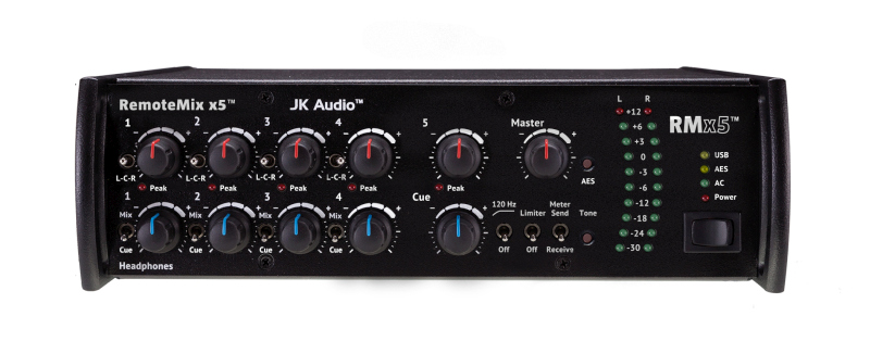 JK Audio introduces RMx5, a portable five-channel field mixer / headphone amplifier with a 24-bit USB codec and AES Digital Output. Radio/Podcast – RMx5 is designed for news, sports, and live remotes. Use it as a front-end mixer for your POTS, ISDN, IP or smart phone codec. XLR out, XLR or ¼” stereo return to headphones. Use the USB interface to stream audio through a laptop soft codec. TV – RMx5 is designed for ENG, Sports, and interviews, with four ¼” headphone outputs. 3.5 mm TRRS connection provides 2-way IFB audio from your cell phone or notebook. AV/Conference – Perfect for small press or hotel conferences. All-in-one design is easy to set up and operate. Record and play back high quality audio through the USB codec. Rugged design for field use, runs > 8 hours on two hot-swappable 9-volt batteries. RMx5 can route audio through cell phones or notebooks with the included 3.5 mm TRRS headset interface cable.